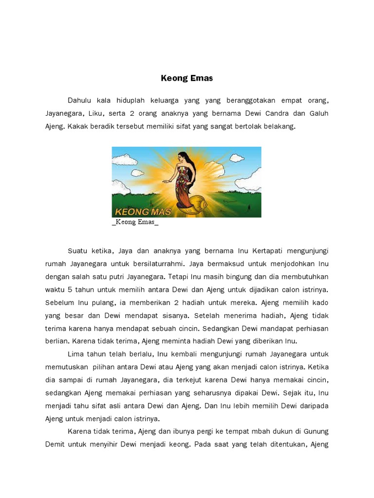 Admin dari blog Berbagai Unsur 2019 juga mengumpulkan gambar-gambar lainnya terkait unsur intrinsik cerita rakyat keong mas dibawah ini. Cerita keong mas berasal dari daerah Jawa Timur keong mas adalah salah satu cerita rakyat yang cukup terkenal atau populer. Dahulu kala hiduplah keluarga yang yang beranggotakan empat orang Jayanegara Liku serta 2 orang anaknya yang bernama Dewi Candra dan Galuh Ajeng.
