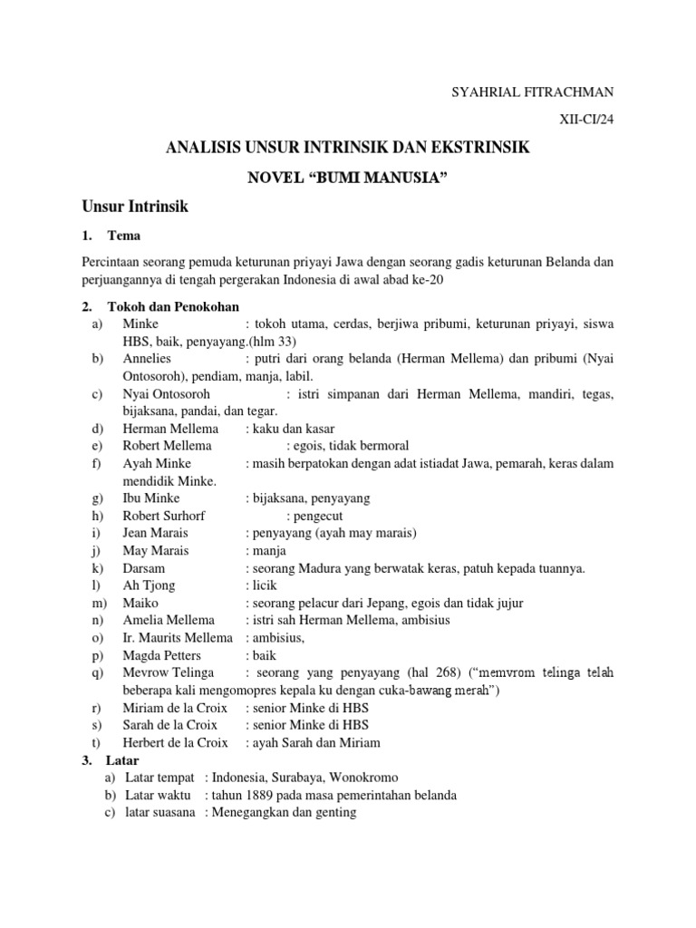 Analisis Unsur Intrinsik Dan Ekstrinsik Novel Bumi Manusia Berbagai Unsur