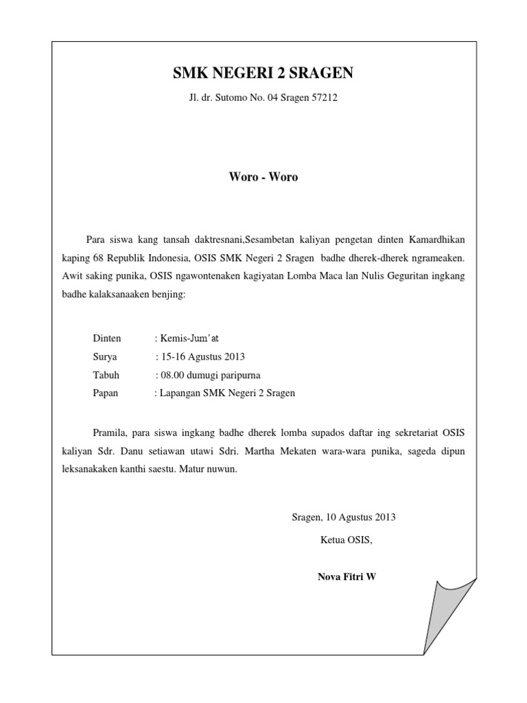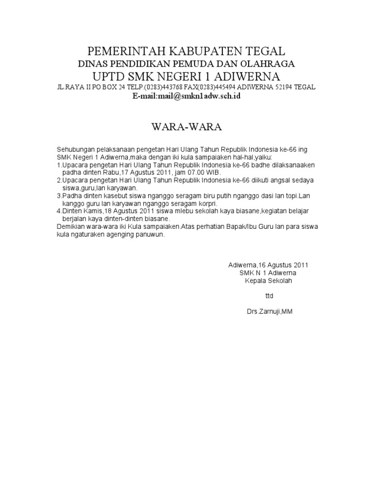 Wara Wara Resmi Bahasa Jawa - Wara-wara lomba ing sekolah kalebu wara-wara saka panitiya resmi sekolah. Setunggaling Tuladha Wara-wara Wara-wara Bahasa Jawa Pengumuman Berbahasa Jawa Tuladha 1 WARA-WARA Siswa kelas X XI lan XII kang tansah daktresnani Sesambetan kaliyan pengetan dinten Pindhidhikan NAsional pramil.