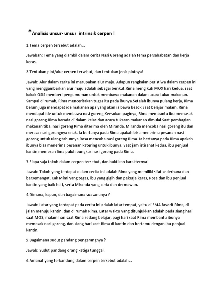 Unsur intrinsik cerpen nasi goreng. Meski hanya sayur bayam dan tempe goreng itu jauh lebih bergizi dari yang dimakan oleh Maman. Menentukan latarsetting tokoh watak dan sudut pandang dalam cerpen f. Pada LKPD halaman 50-514C Pembuktian Perwakilan kelompok mempresentasikan hasil kerja kelompok perwakilan kelompok menanggapi PPK.