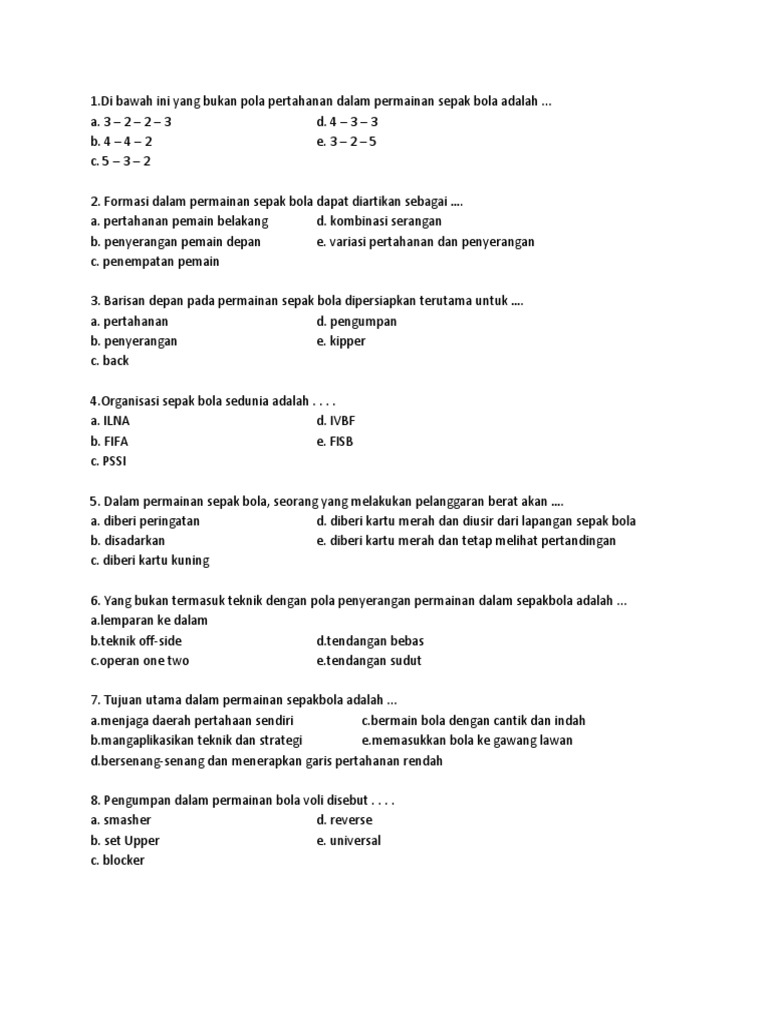 Yang perlu diingat adalah stamina dan daya tahan tubuh masing-masing. Berikut ini yang tidak termasuk teknik dengan bola pola penyerangan dalam sepakbola yaitu. Berikut ini yang tidak termasuk formasi permainan sepak bola yang sering digunakan adalah.